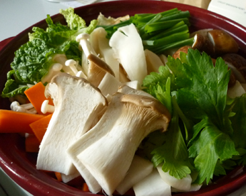 食卓用の鍋に、適当に切った白菜、大根、パースニップ、ニンジン、ネギ、セロリの葉っぱ(!)、豆腐、なんかをドッサリ入れて、
