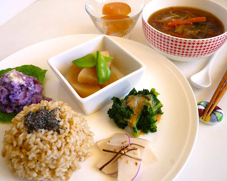 写真はプレートの一例:玄米ご飯、紫芋の豆腐マヨサラダ、大根のふろふき、季節野菜の味噌汁、青菜のゴマ和え、カブの梅酢漬け、フルーツコンポート