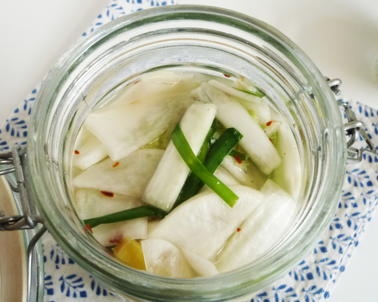 Water Kimchi: Kimchi is a very popular Korean style of pickles packed full of enzymes and probiotics. Water kimchi is more mild and easier to make than spicy red Kimchi.