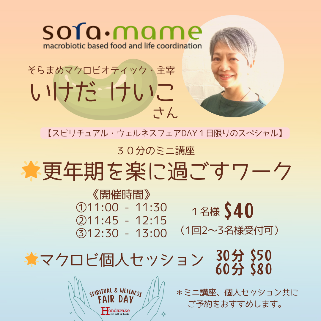 そこに、なんと今回soramameも30分ミニ講座「更年期を楽に過ごすワーク」で、小さなブースを出します!