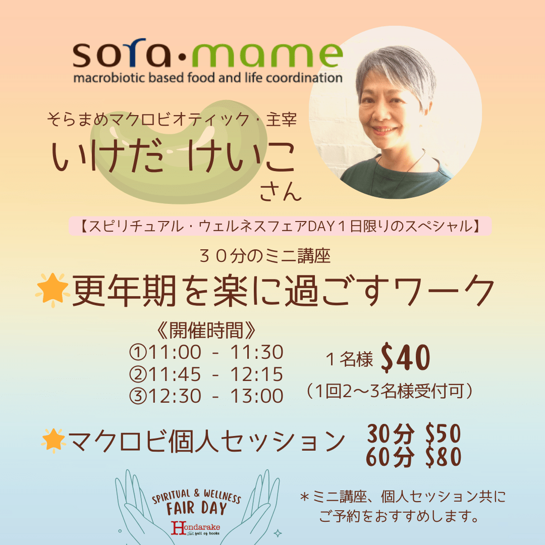 普段はオーストラリアのシドニーでマクロビ料理教室やセミナーを開催しているsoramameですが、この度5月にビュ〜ン、と東京に飛んで『更年期を“ゆるり”と越える』をテーマに、銀座と原宿の2箇所で勉強会を開催することになり続きを読む “勉強会『更年期を“ゆるり”と越える』開催”